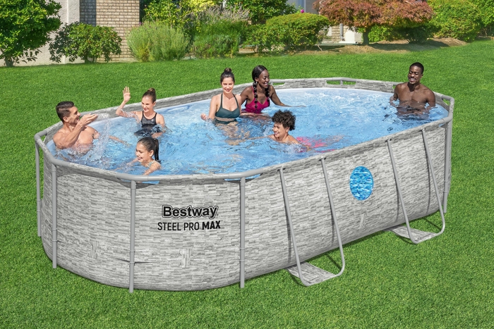 בריכת 56946 מבית BESTWAY מציעה שילוב יוצא דופן של סטייל וחדשנות. הדגם מתאפיין בצורה אובלית (סגלגלה) המנצלת את שטח החצר בצורה חכמה, וכולל את טכנולוגיית ה-™Splashview – שני חלונות שקופים ואטומים המאפשרים הצצה פנימה והחוצה מהמים. עם הדפס אבן חיצוני מרשים ומערכת סינון חול עוצמתית, זוהי בריכה המיועדת לעמידות גבוהה וחוויית שימוש יוקרתית.