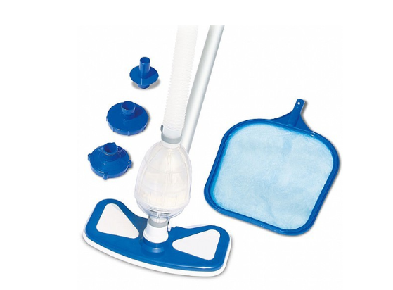 ערכת ניקיון ידנית לבריכת שחייה INTEX מתאימה לבריכות קטנות ובינוניות , הערכה כוללת רשת עלים שטוחה צפופה, מוט טלסקופי הנפתח לאורך של 239 ס"מ,ראש ואקום העובד על לחץ מים המסופק מצינור גינה ע"י לחץ המים הלכלוך נאסף לרשת צפוצה המורכבת בראש השאיבה . מחבר לצינור 16 מ"מ.