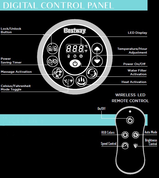 - קיימת תאורת לד בעלת 7 אורות לד צבעוניים מתחלפים המופעלים ע"י שלט רחוק.