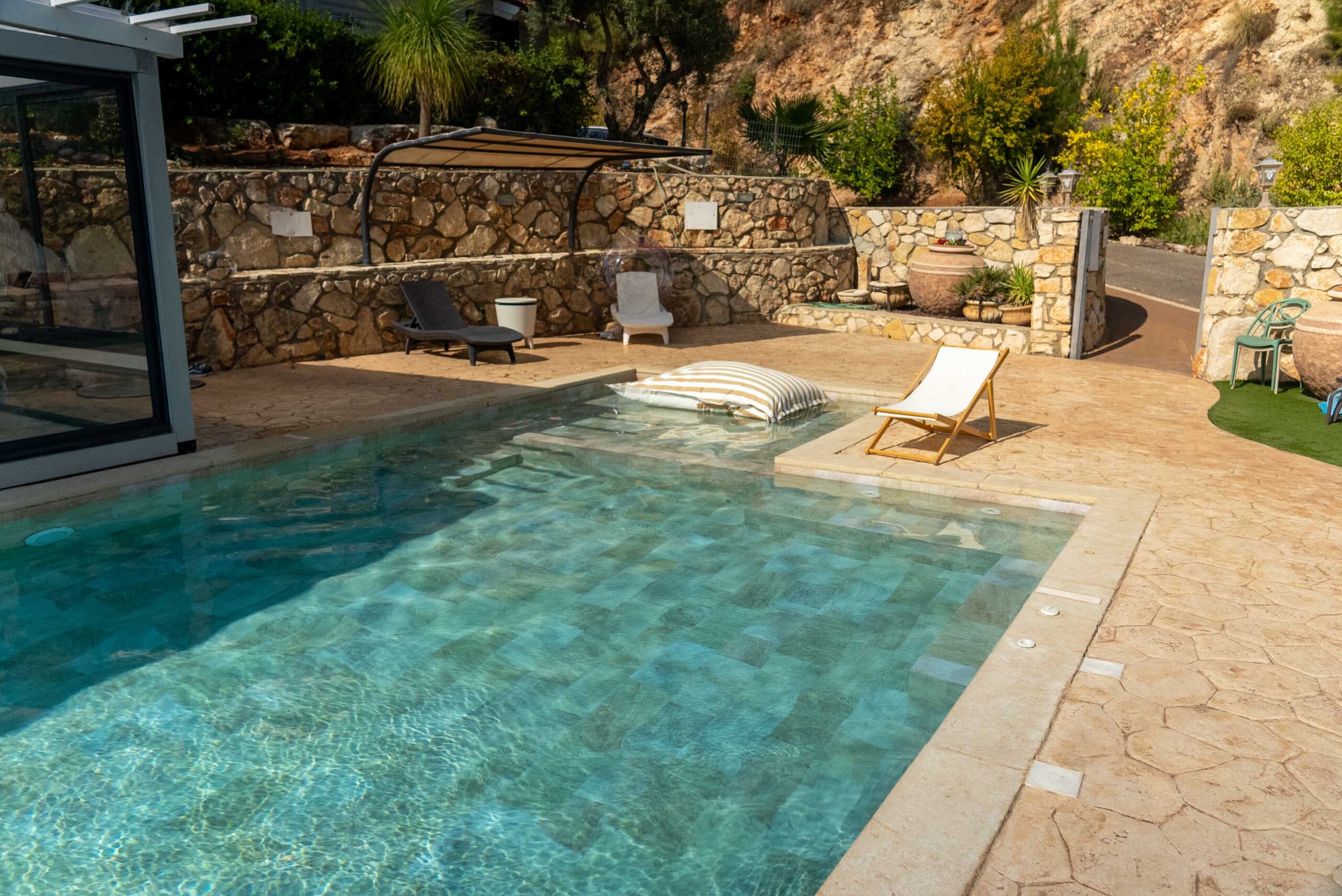 גימור יבש המדמה אבן טבעית עם אחיזה מונעת החלקה, לשימוש בטוח בסביבת מים.